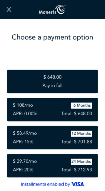 Installments Enabled by Visa allow for the cardholder (with an eligible card) to pay for Purchase and Pre-Authorization transactions to be paid in segments by the cardholder while the merchant gets paid in full. During the transaction process, a screen will show up and prompt the user if they want to pay for this in installments. If the cardholder selects for the payment to be made in installments, the installmentOptIn field will be returned in the response to the request.